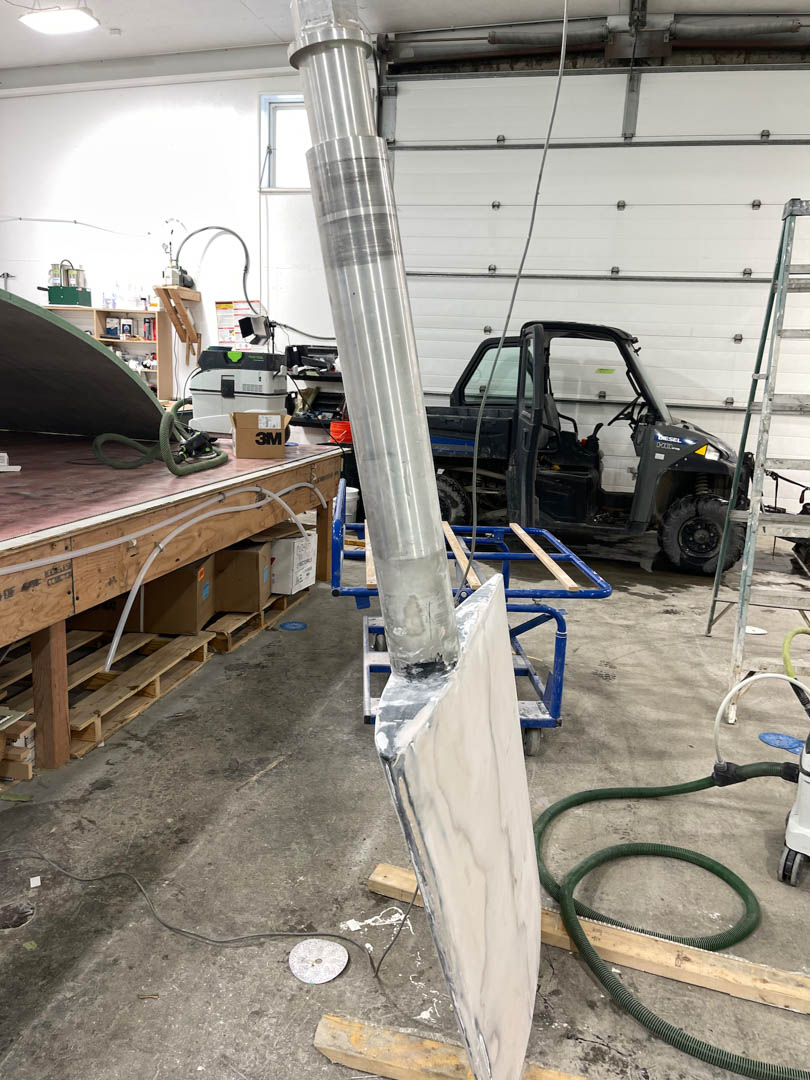 When I went back to get a shot of the finished panel they were putting the finishing touches on the rudder modifications for Stan’s boat, the Buffalo Nickel. They are adding to both the leading and trailing edges to fine tune the steering system. You’ll see more in the coming days.