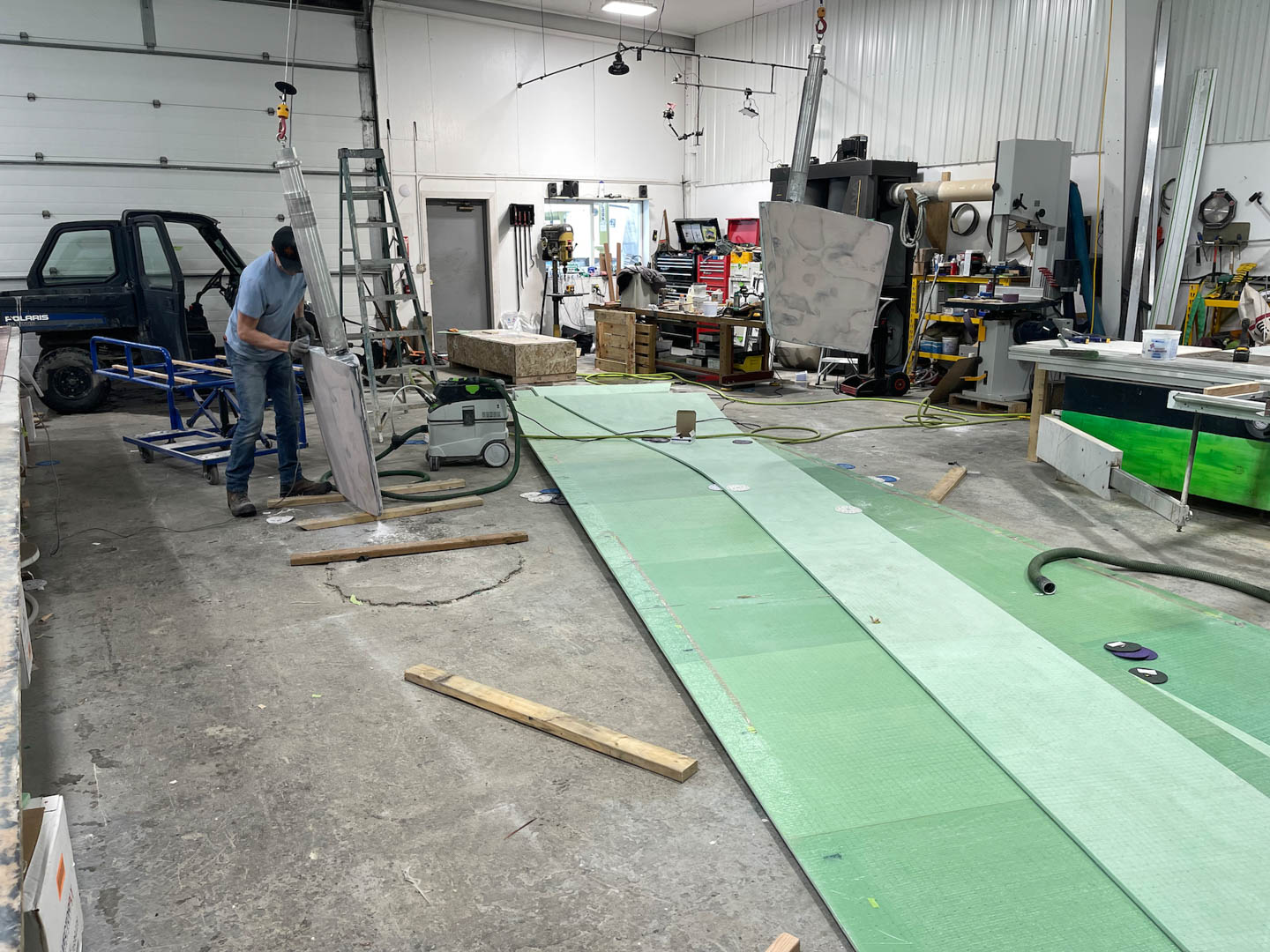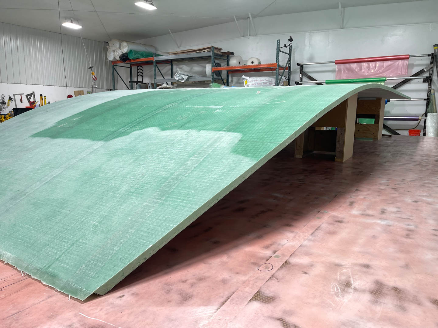 They have a giant super flat table for vacuum forming panels and all the various parts of the structure. They have a foam core board that has scoring about 3/8″ deep and apart to facilitate the infusing of the epoxy resin and also serve as scarfing to allow the boards to be slightly bent where necessary.