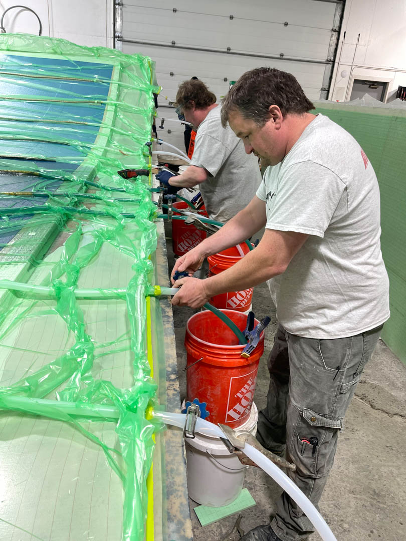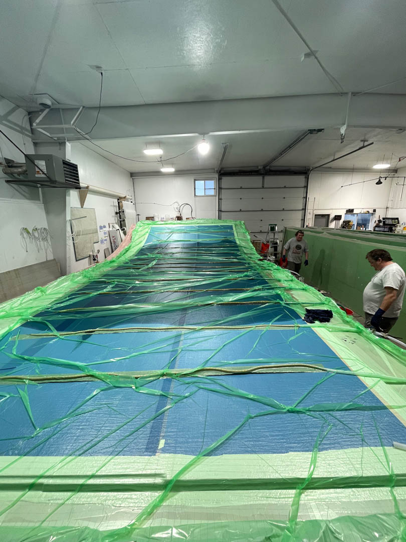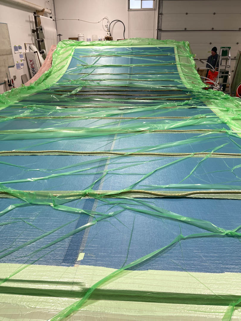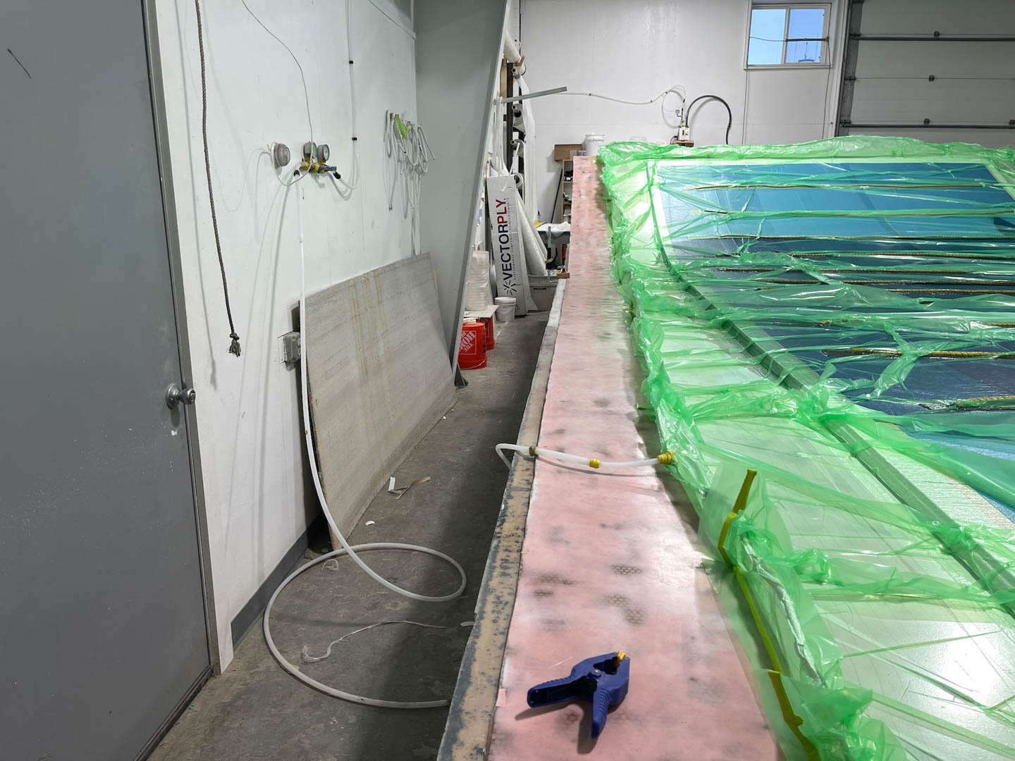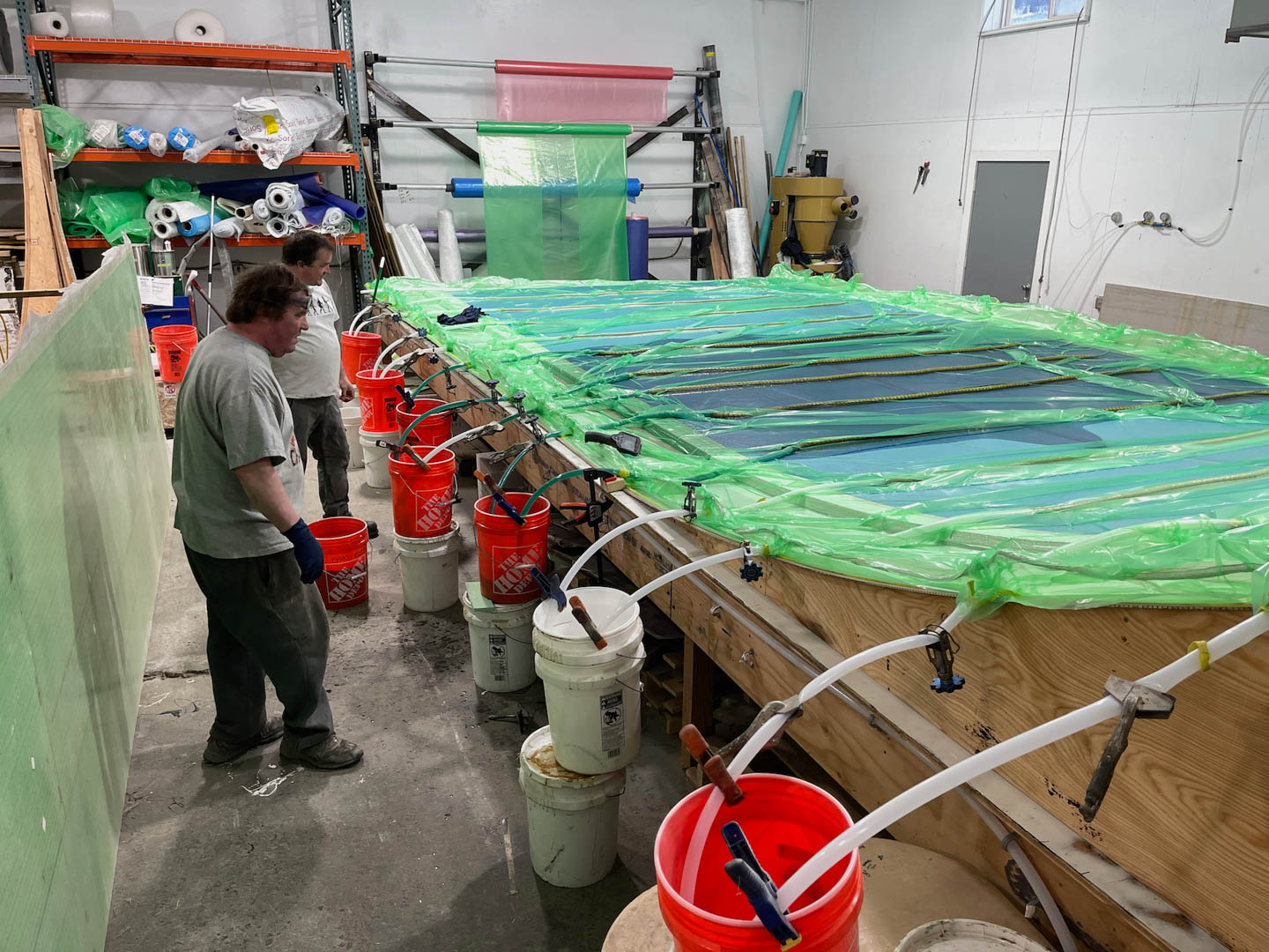 They completed the resin infusion and let it cure overnight. After curing and clean up they’ll turn it over and start building the hulls on the upside down panel. I’ll stop by and get some more photos as they progress.