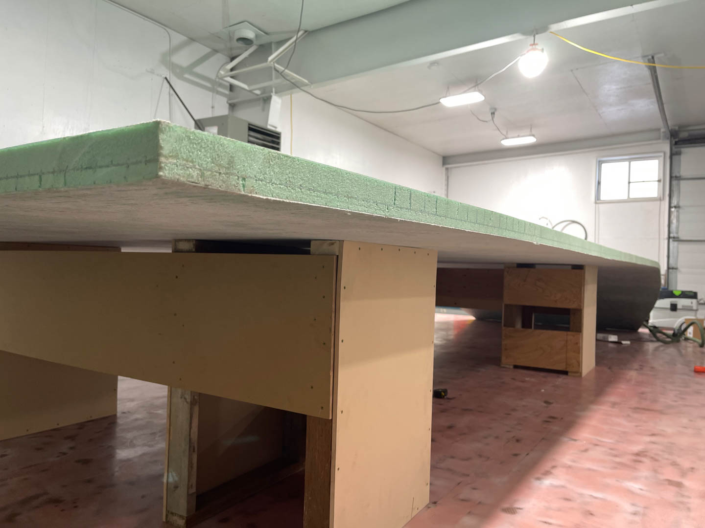 The task for the day will be laying up a foam core for the bottom of the center cabin.