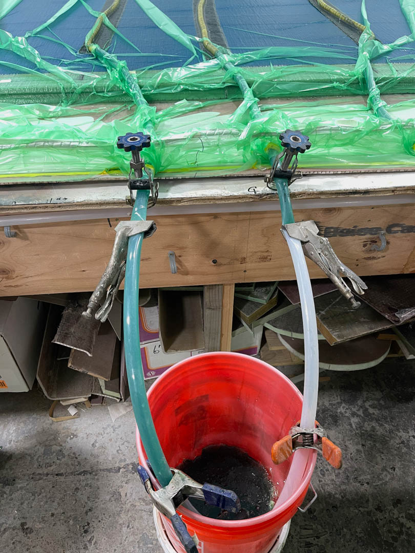 Each bucket at the pour feeds two of the tubes that suck the resin out and deliver it to the top of the panel. The tube on the right in the bucket below has finished supplying the panel and has been clamped off permanently. The tube on the left is still flowing resin to the panel. Thus the pour proceeds from right to left, with all tubes clamped off when finished.
