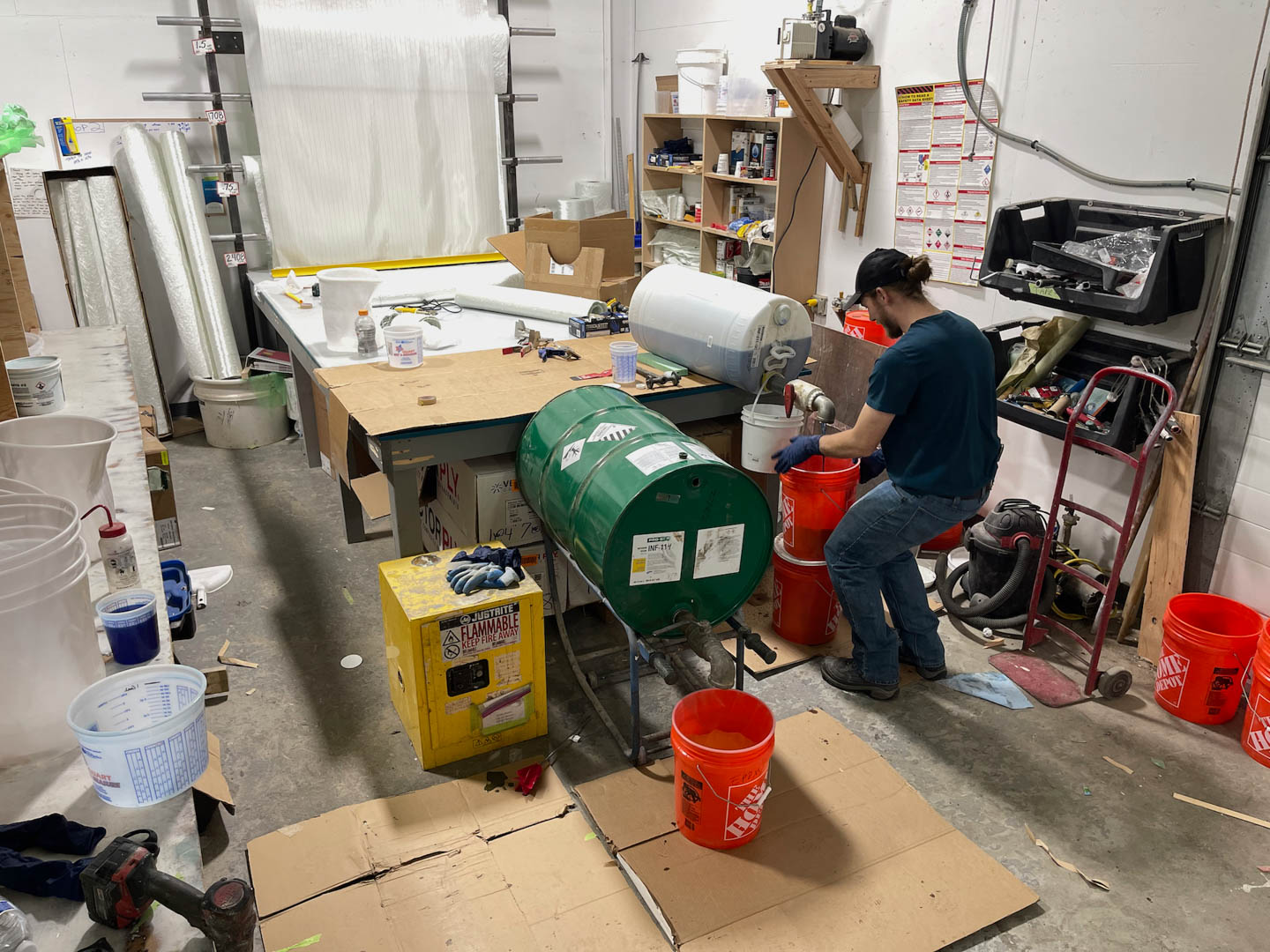 The resin is introduced in the middle of the panel through flexible plastic tubes running across the top of the panel inside the “bag”. The resin is mixed in 4 gallon batches at the top of the table.