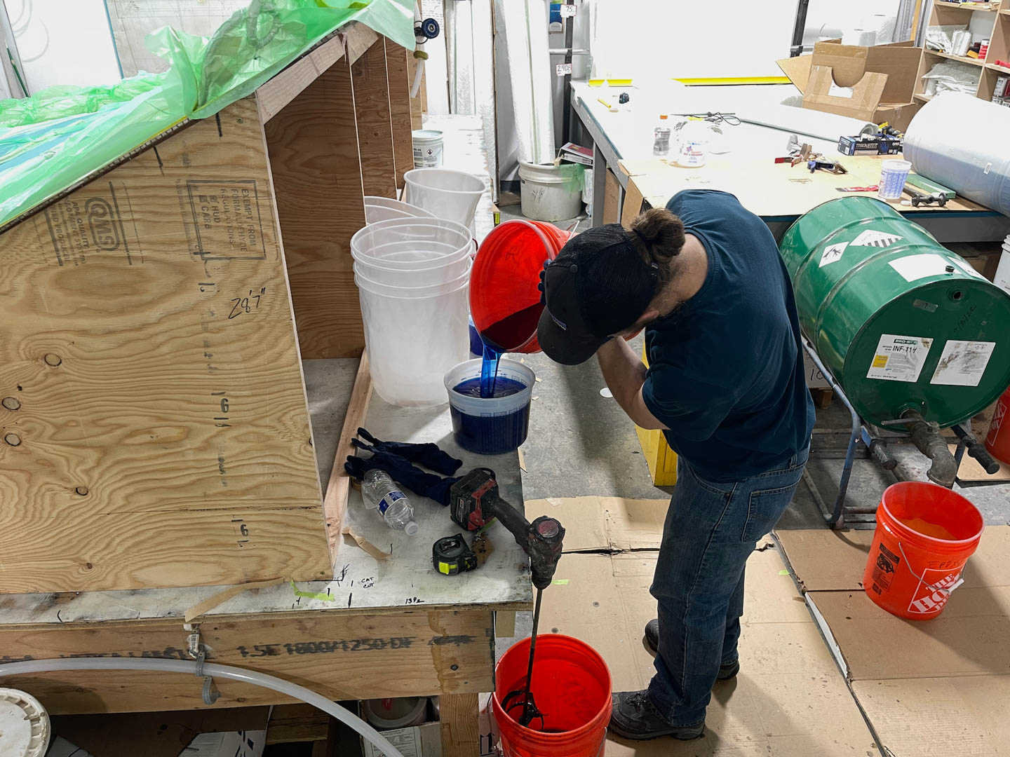 Communication is critical. Here the pour master is monitoring the right side of the pour while Micha works the left side. The mixer just keeps delivering resin to each as needed. You can see the leading edge of the resin flow out in the middle of the panel.