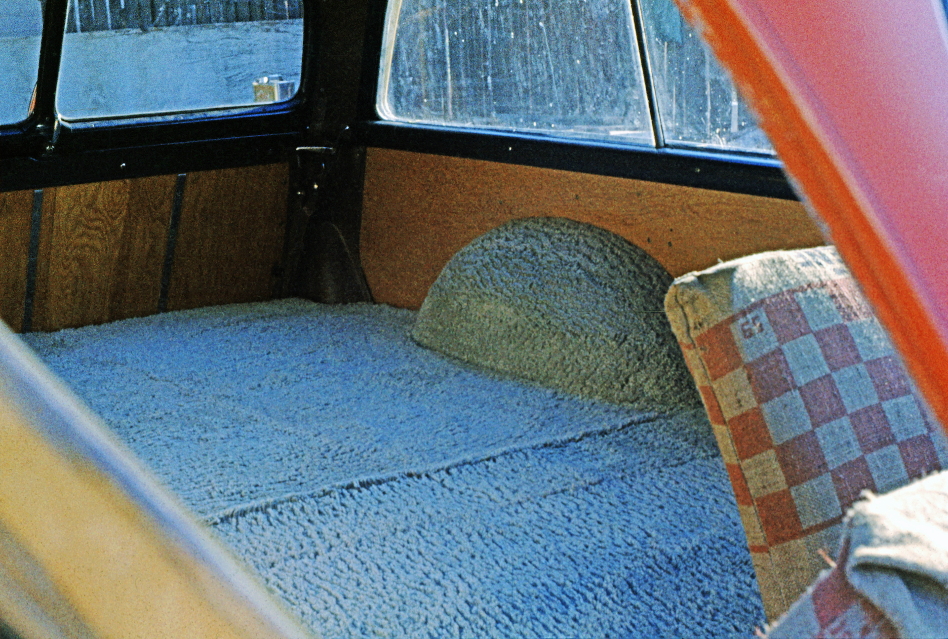 I house sat a neighbor’s house for 30 days while they went on vacation. The owner was Dr Reese, the veterinarian who had his hospital and home just down the road from us. He offered to have my woodie painted at Earl Schibes. At that time Earl was painting any car for $29.95 + whatever body work was needed. The woodie only needed a few patches of body work and the shop threw it in for free because the car had a lot less area to paint compared to a regular wagon. And yes, those are burlap grain sacks that I used for seat covers. A little scratchy, but right in my budget.