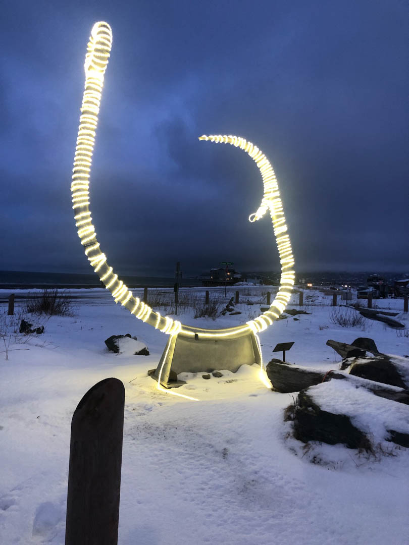 Looking out over the spit the other morning I noticed that someone had festooned our entry into the world’s largest halibut hook competition with lights. So I had to drive down for a closer look.