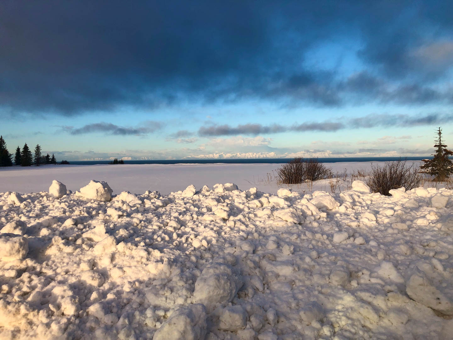 This view is from a large turnout on the Sterling highway. In the summer you can walk across the hay field to stand on the edge of a cliff overlooking the Cook Inlet. No fence or warning signs, just a view. The snow berm in the foreground (over 6′ high and 20′ across) is a result of plowing the turnout and sufficient barrier for now.
