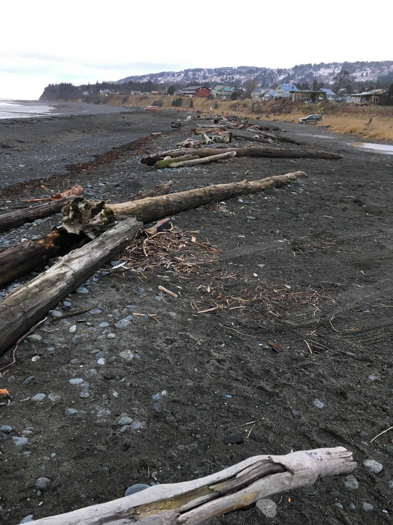 I also owe you a photo that I did not have for the last post. I said that we had a lot of driftwood. This is looking West; my apartment is just to the right and behind the big red/brown building with all the windows (the Elks Lodge).