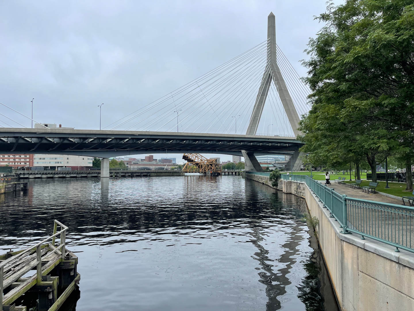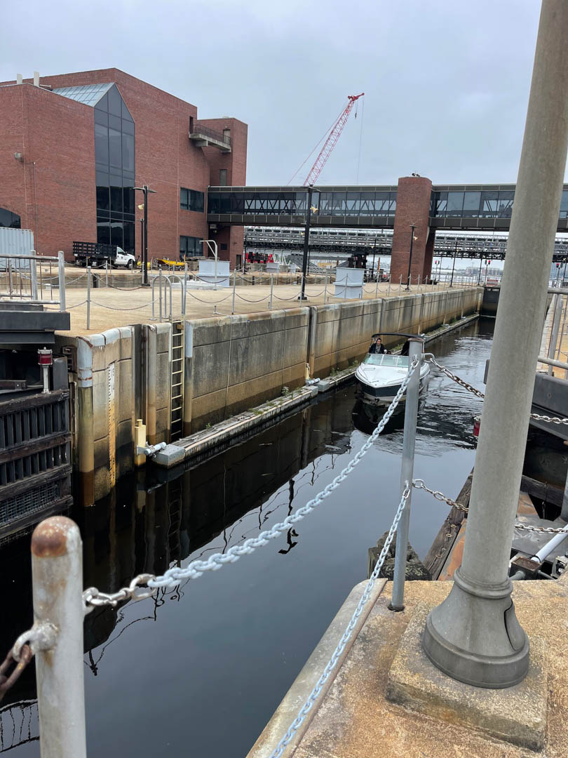 Technically in the Charles river, the marina was next to a lock system run by the state police. They had a pedestrian walkway over the four side by side locks.