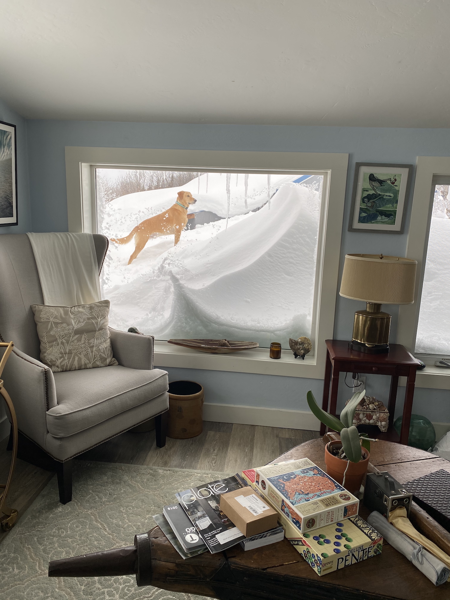 He doesn’t like it when the snow cascades off the roof to crash onto the deck at home. He often gets to have a sleepover at our house when it gets too much for him in the spring.