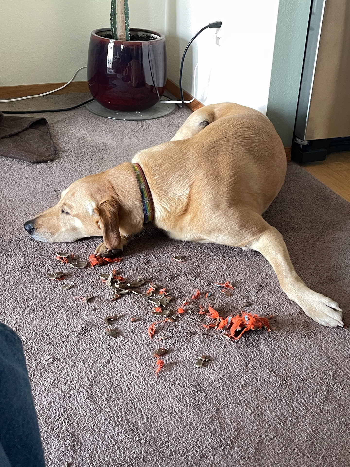 He remains the undisputed champion at destroying ANY ball, stick or toy. This was an ordinary tennis ball in just a few minutes. He takes a little longer to shred the tougher ones but even the Kong super strong eventually succumb.