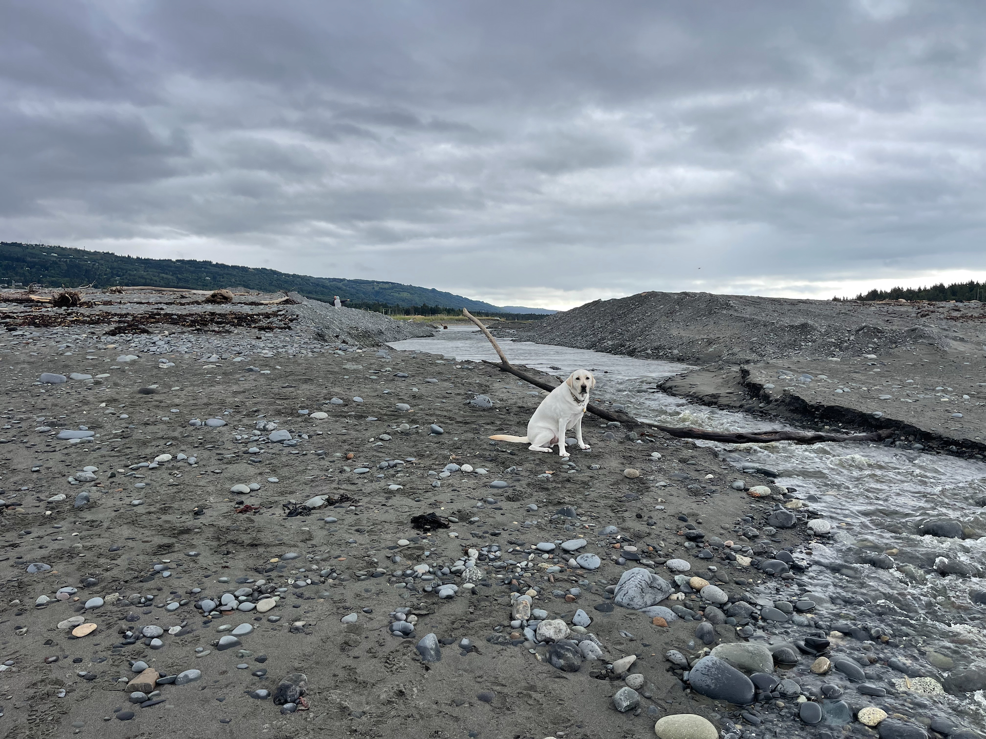 The beach and the high school are the only places in town where Earl gets to chase balls and other puppies while off lead. That brown dot at the top of the outlet is a chocolate lab.