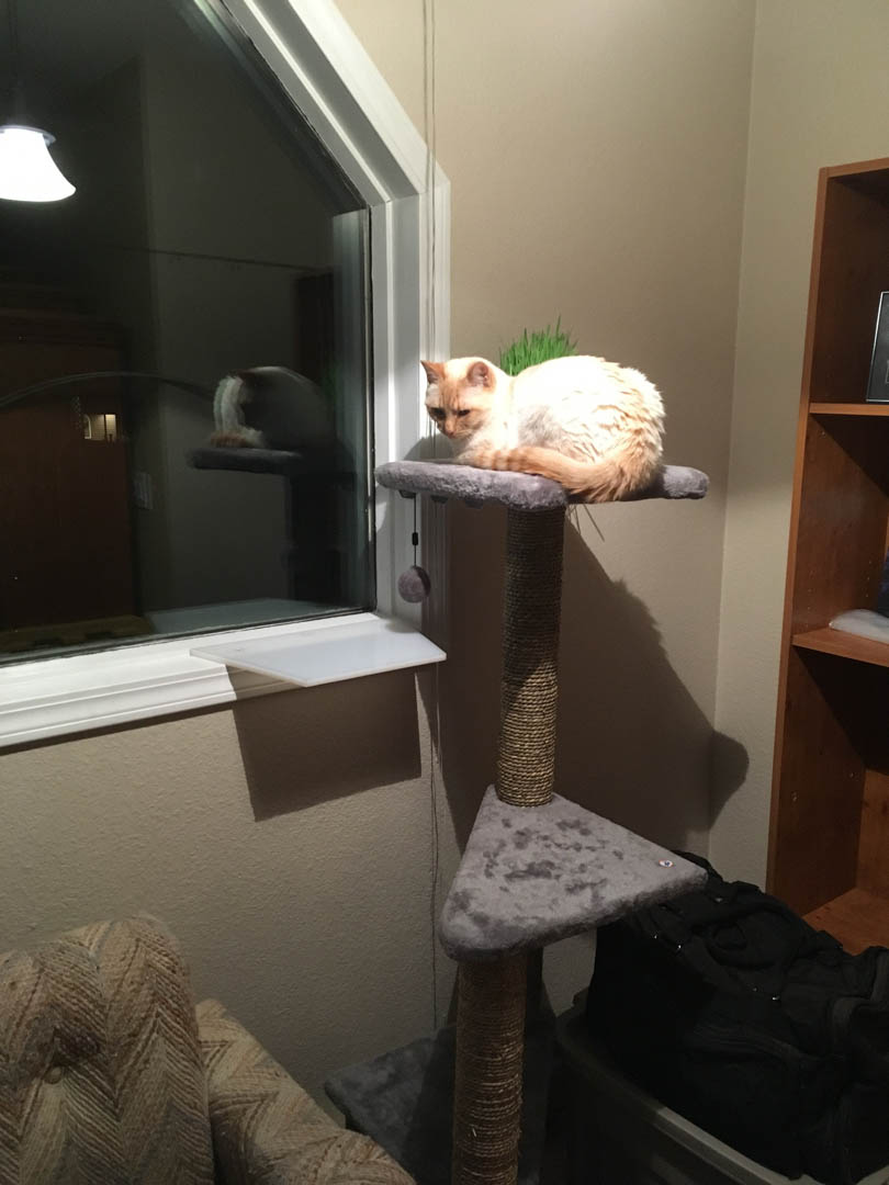 It took her a week to check out the tree. I had to put the oat grass (yes, I bought grass so she doesn’t have to go outside to eat grass) on the top to get her to try it. Now she is starting to enjoy the perch at our only suitable window.