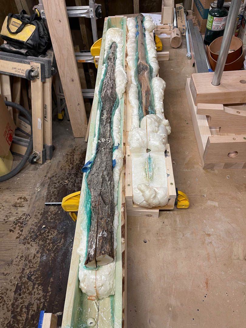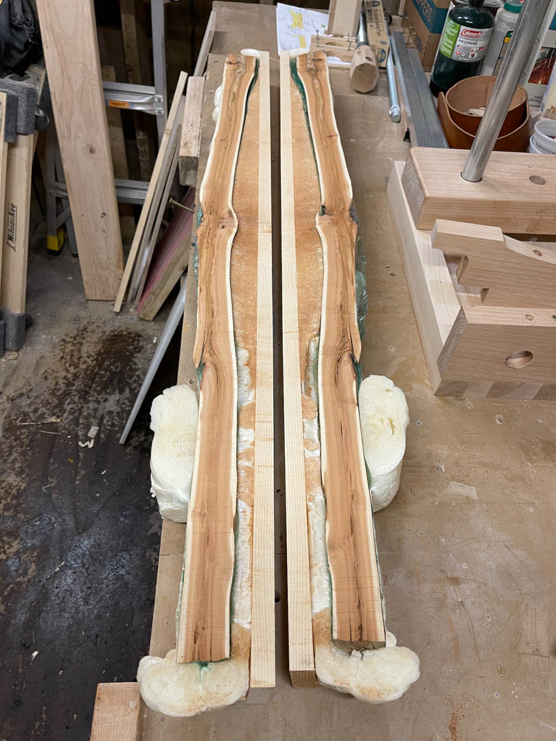 After a consult with Colin and Rock, I built some sleds to hold the sticks. Then I shrink wrapped them and used spray foam to hold them firmly while we fed them through the saw. Again, this is after the cut, so some of the shrink wrap has already made it to the trash.