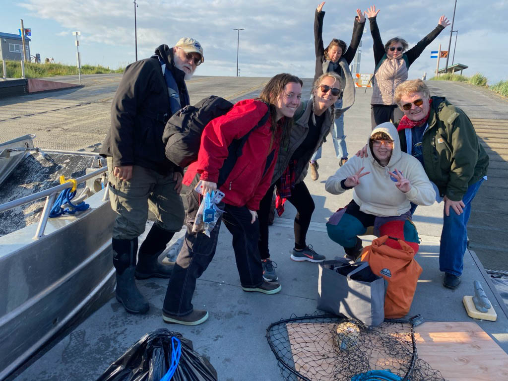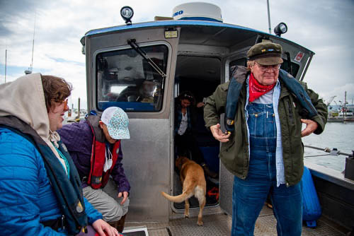 Left to right of the bow of Don’s landing craft catamaran is, Don, Sid, Sarah, Drew and me; in the leaping section, Liz and Melody