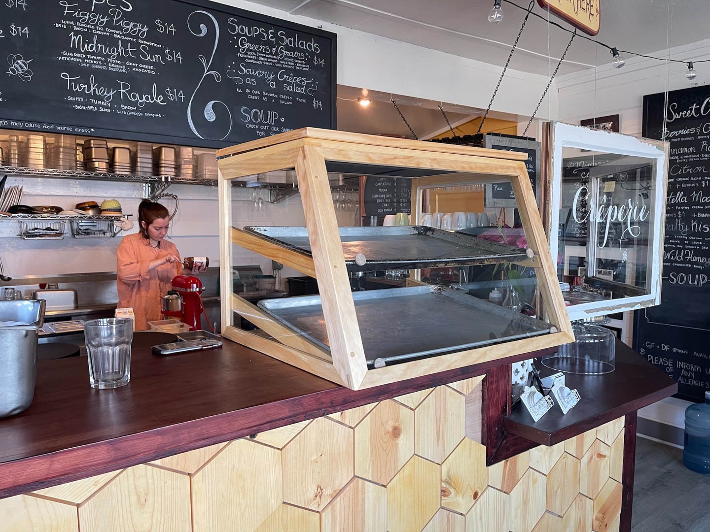 Melody asked me to build a pastry display case for the counter top at the Wild Honey. She wanted it to hold two full baking sheets and have screen on top and back to prevent condensation on the glass and keep bugs out.