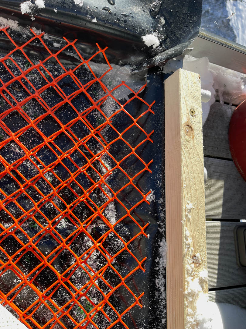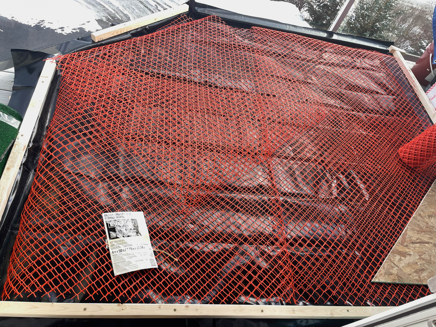 The frame is 2x6s on edge with OSB for a floor. Here’s the drainage system between the astro turf and the waterproof pond liner.