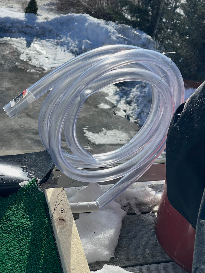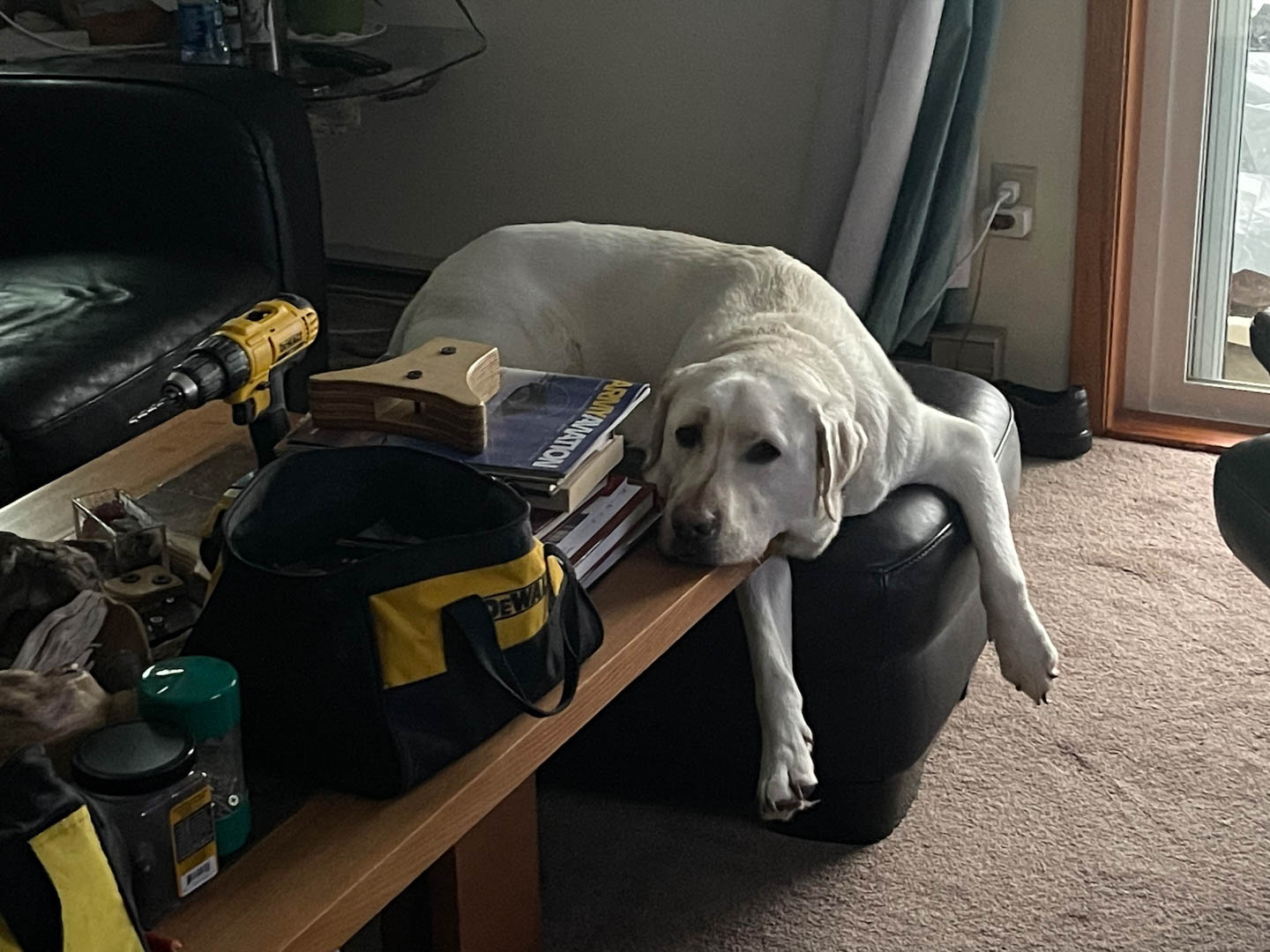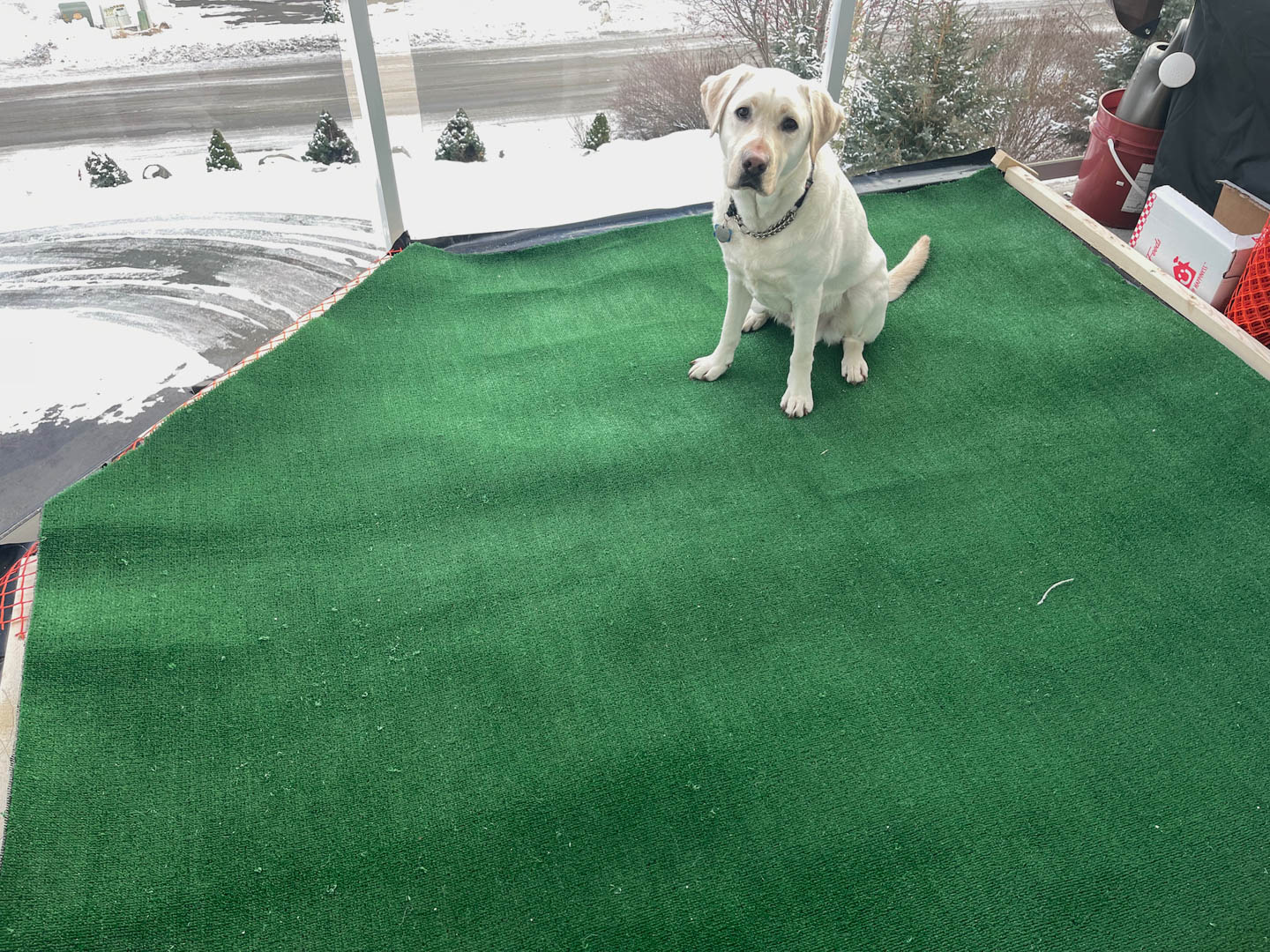 When I decide that he can do without it, I wake up to a black nose staring me in the face, two big brown eyes above that and the clock on the dresser above that showing 3:00 AM. Although I’m in better condition to make the trip, I’d really prefer just letting him out to figure it out himself (I would never do that). So I decided to make a place where he can relieve himself on my deck. I threw down an old blue tarp (there are a lot of those up here) to see if he would use it. He will but just a leaky old tarp won’t cut it. The need for the tarp is not to protect the deck, rather to prevent doggy pee and crap from raining down on my downstairs neighbor’s deck directly below. I just think Julie would not understand.