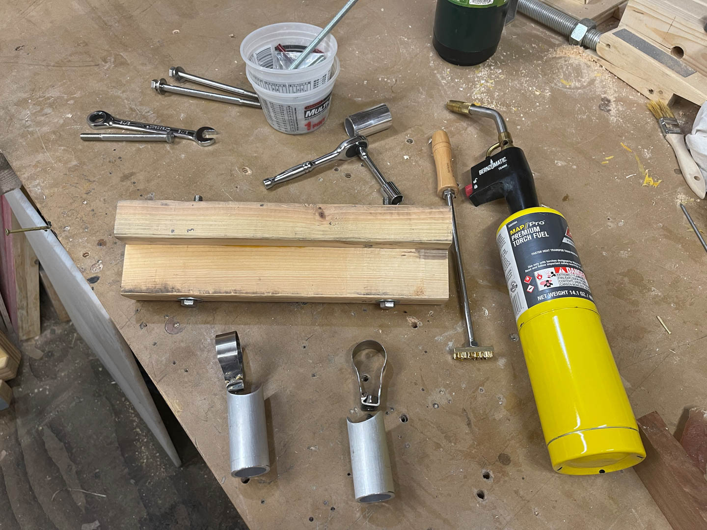 I used the strap from a heavy duty stainless pipe clamp and brazed it to a nut. Then cut some aluminum tubbing for the standoff.