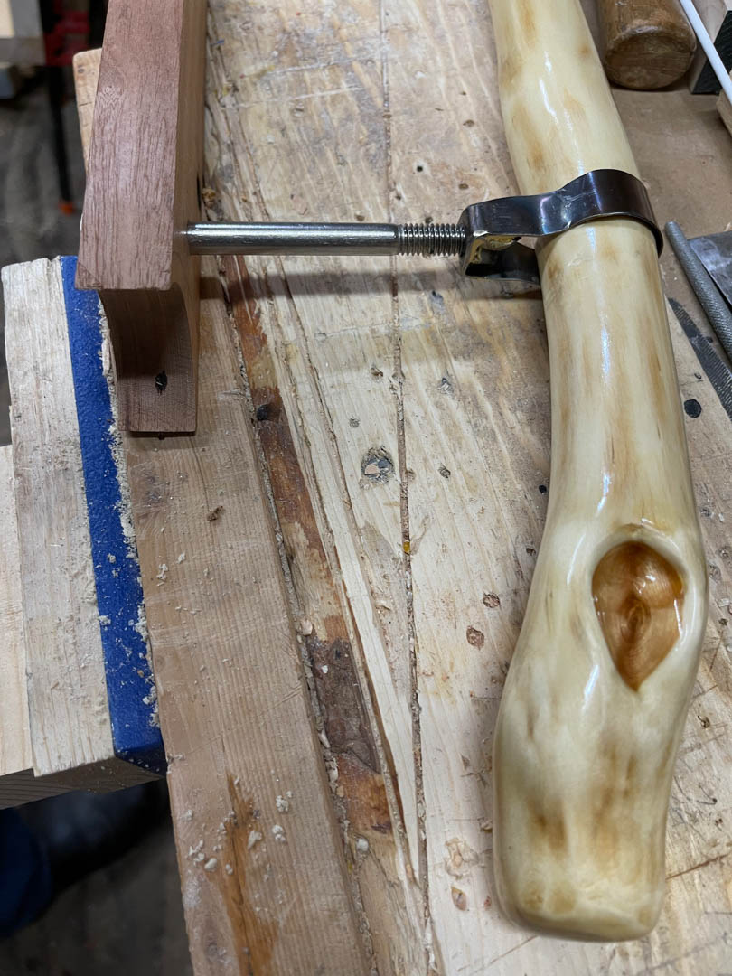 They said the step from the path up to the “porch” could use a grab bar. So we found a short scrap and I devised an attachment system.