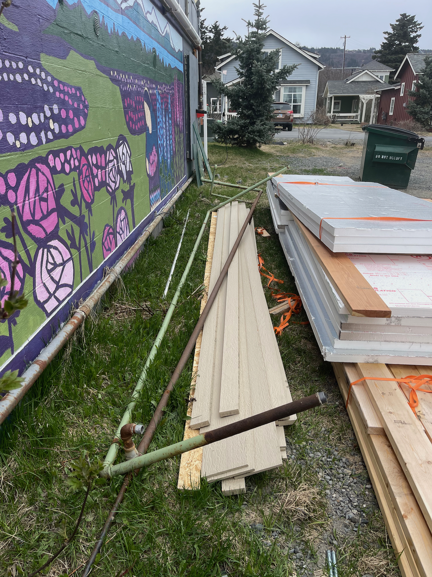 The gray pipe is for future electric service to the “phase two” build, down the road. It needs to move about 6″ to be on the outside of the wall.