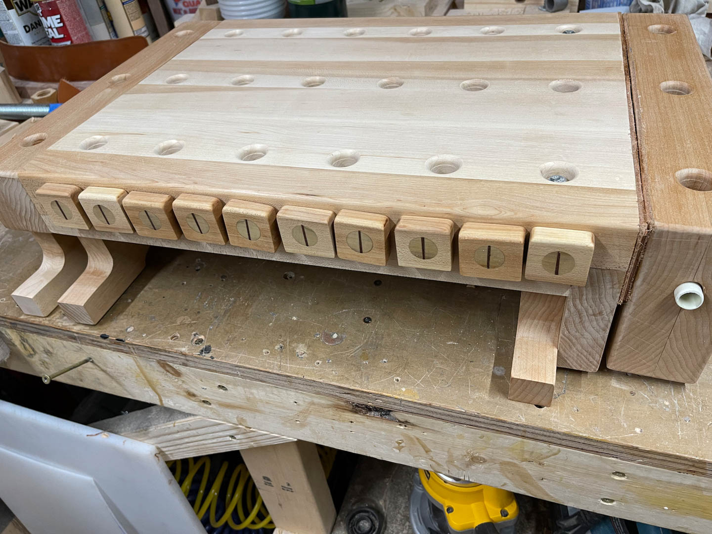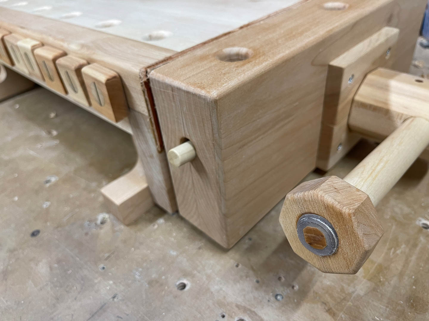 You may have noticed that the bench dogs have a parking place. I drilled holes in the side of the bench and put a small screw in the center of the bottom of the holes. All that was left was to glue a magnet to the bottom of the dogs and they will stay put between uses.