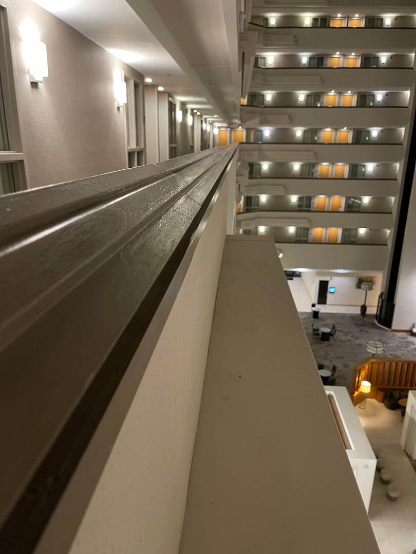 The interior balcony railing is a simple arrangement of three strips of wood and there is 2400 feet of it on the eight floors.