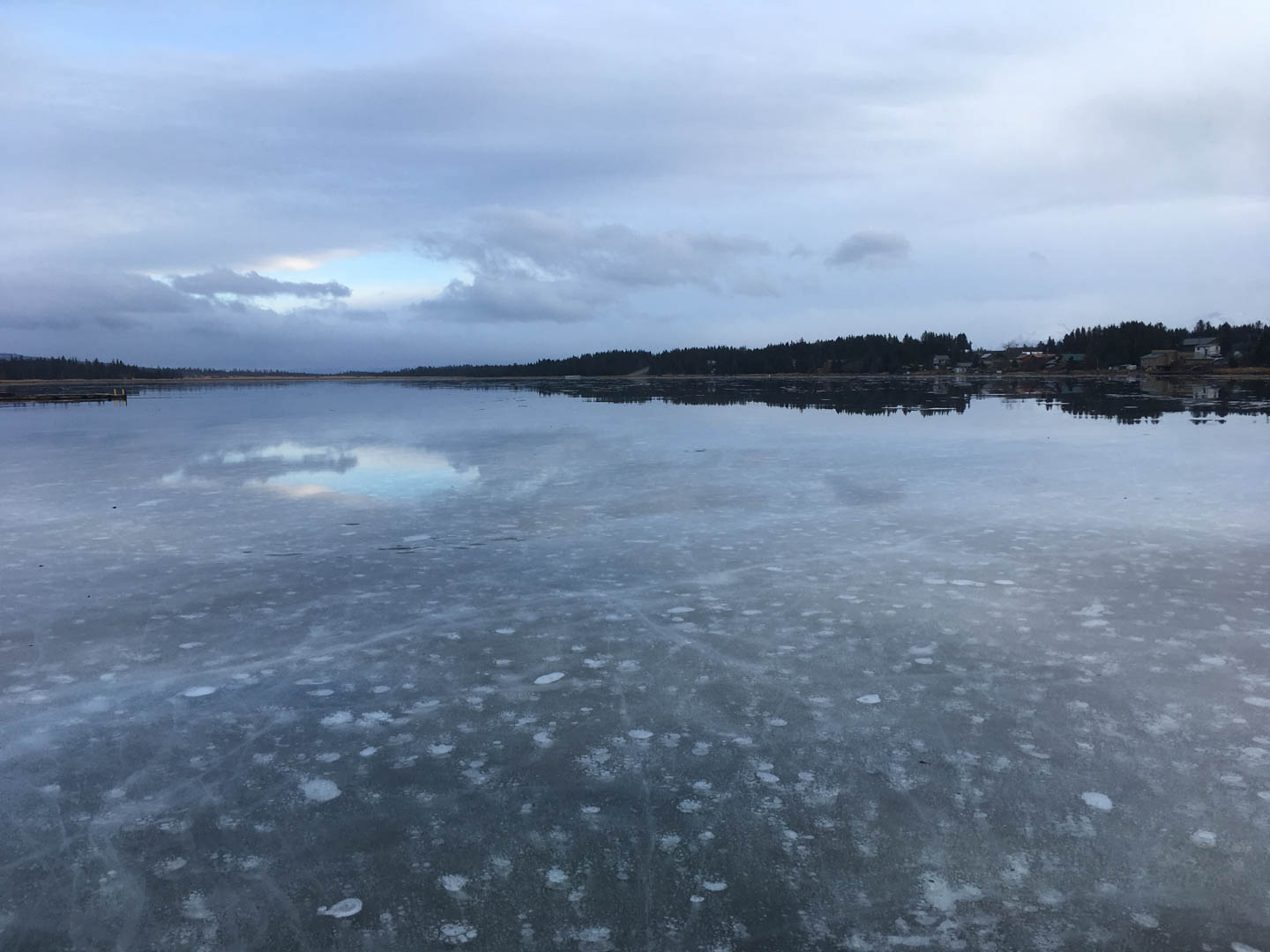 Beluga lake had a thin fog just burning off. The tracks are from a one dog sled that a Dad on skates had used to pull his daughter around the lake. This was it looked like two days ago with a thin layer of rain water on top of about 6″ of ice.