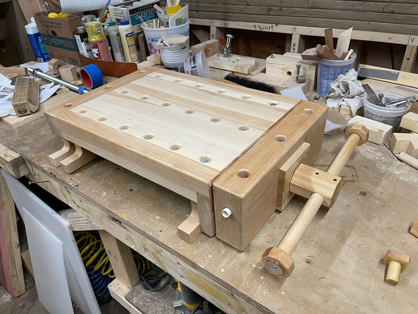 Yes it is finished. I put leather on the vise jaws and made the stops for the extension. With it fully expanded it will hold a board over 42″ long. The white tube sticking out of the front vise jaw is the tool for changing the extension.