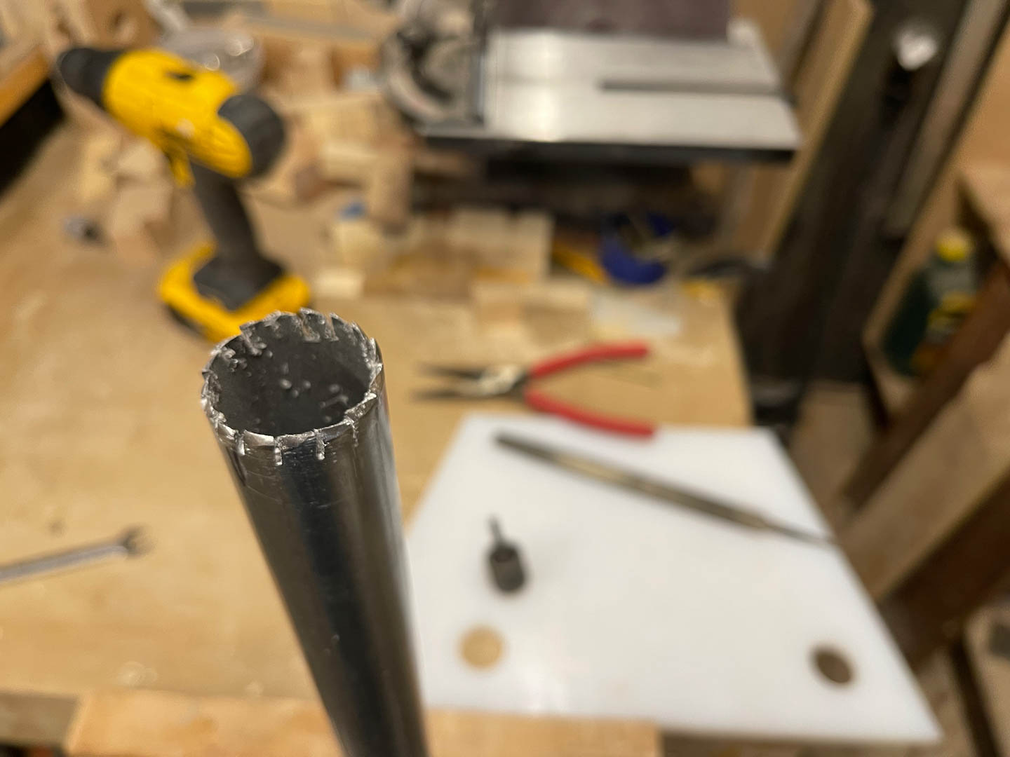 Continuing with the build; getting close to the finish. Still have some details with the vise and then the next step will be the top extension. First on the detail list are some guides for the front jaw guide tubing. I had some UHMW scraps that will do nicely but the hole required is just slightly over any standard drill bit size. Solution was to drill out to the closest size and use the tubing to ream it out to the perfect fit. It was a lot easier to make the tool than I expected. Just some short hack saw cuts and very little filing. I had to tweak each “tooth” slightly but this was easy to do with needle nose pliers. In the background is a 1″ sanding drum which fit nicely inside the tubing and enabled me to chuck it up in a drill.