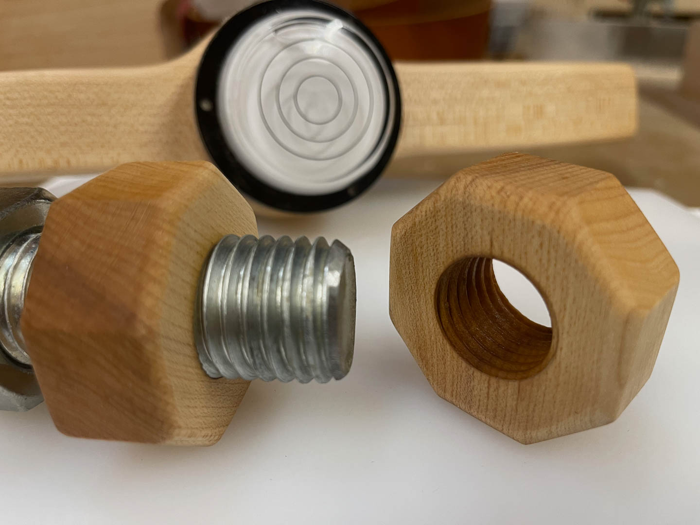 Next, make the handle for the vise. I cut some 1″ nuts out of maple and ran a die through them. The first try resulted in nuts that were crooked. Normally, I would put the die in the drill press but the shank of the die was too big for that so I decided to make a die wrench out of maple.